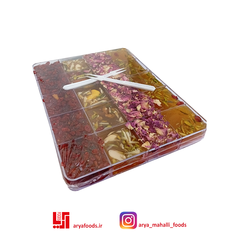 تهیهشده از نشاستهی مرغوب، زعفران خالص، گلاب، کره طبیعی و مغزهای تازه
